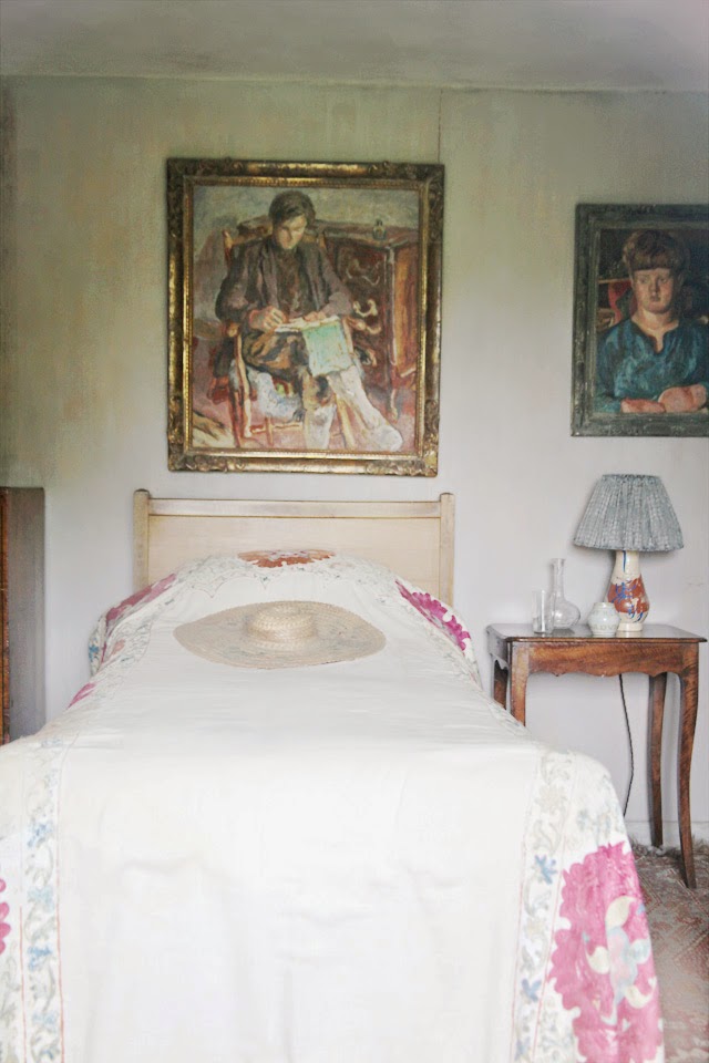 This is Vanessa's bedroom, with the portrait of her son who was killed in the war. Its very plain compared to the other rooms in the house. Several rooms have walls of black/dark grey with stencilled patterns and gold framed paintings. The works of art here collected from their contemporaries like Picasso and Matisse, nestle amongst the handpainted beds, screens, tables, trunks, bookcases and doors. The lines aren't perfectly straight, the finish is patchy ad swirly, and most of all, the colours are brave yet subtle all at the same time.