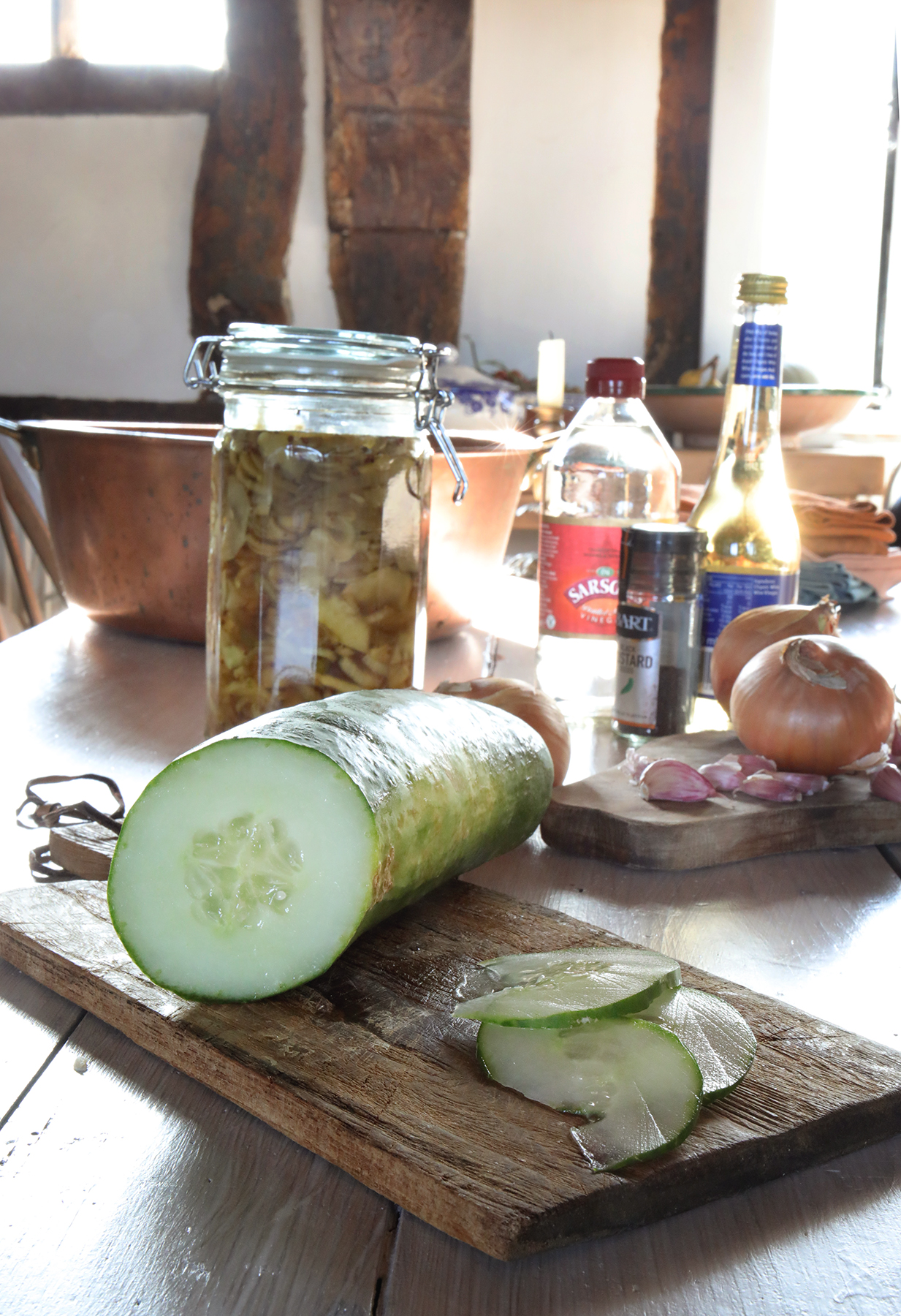 Aside from the tons of tomatoes and courgettes we have had massive cucumbers too and luckily our friend showed up this fantastic pickle recipe from Riverford which is slightly sweet and makes a perfect accompaniment to tuna, cheese and cold meats. It's not a recipe that takes hours of boiling either and I was really quite surprised how lovely it is.