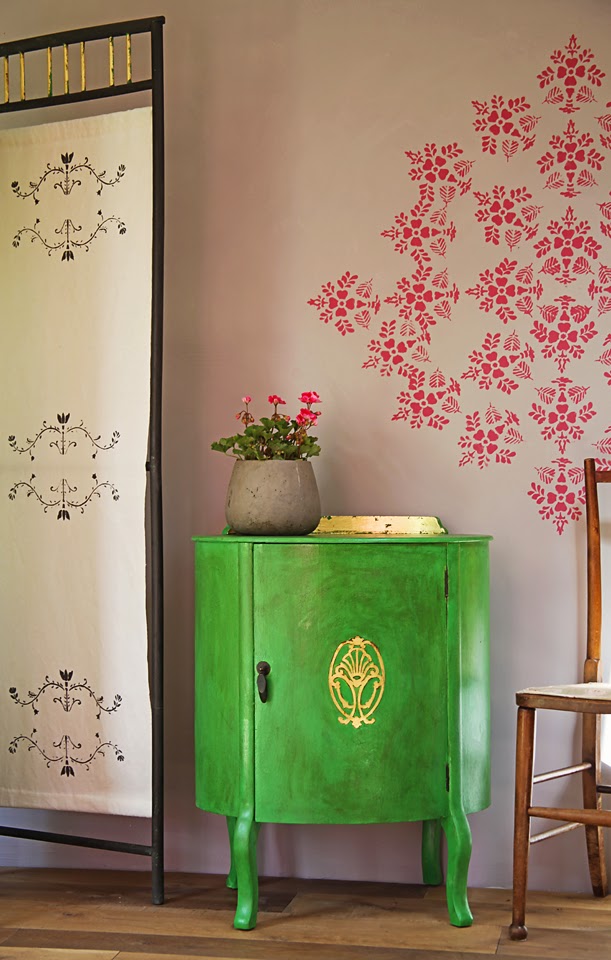 Jane had also found a screen frame missing its panels, she had already found some beautiful french linen sheets and the stiffness of these was perfect as a natural background to the graphite stencil. To add touches of grandeur to the screen and cupboard I used Annie Sloans leaf and gold size glue in brass.