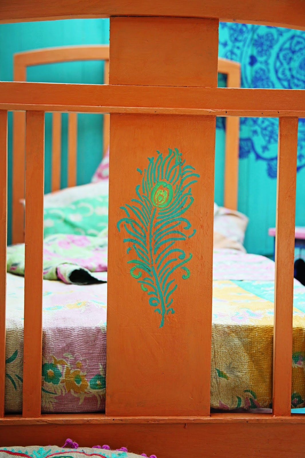 The bed came from good old e-bay, it was painted in Barcelona orange and varnished with the same lacquer as I used on the floor. I again cut a stencil, Im a big fan of peacock feathers I even have some tattooed on my leg, it was also a play on 'feather bed'.