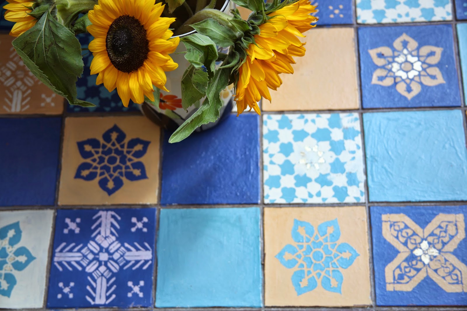 The floor was a quarry tiled dark rust colour which I have never really liked so I was more than happy to see what happened when I put paint onto it. I first painted each tile alternate colours and let those dry. I cut my own stencils again, a variety of different designs and then painted these onto the tiles. Once dry all the tiles were covered with the clear lacquer from Annie Sloan which seals and protects them. On a few of the tiles I picked up some tiny details with gold leaf and varnished over it.