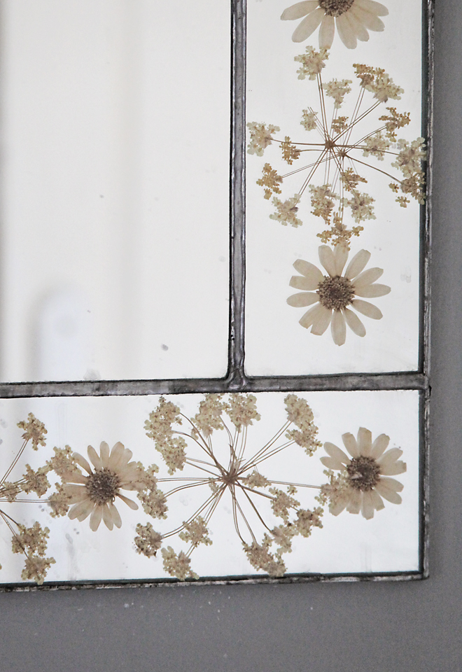 So, well lets have a look at the kind of thing I made and sold at Camden, here is the corner of a mirror I still have in my bathroom which incorporates flowers pressed between layers of glass.