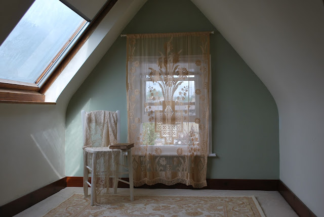 We replaced the oversized curtain on the end wall with a simple piece of antique french lace panel, letting in the light but also suggesting some privacy. Underneath the lovely lace is a roller blind for night time.
