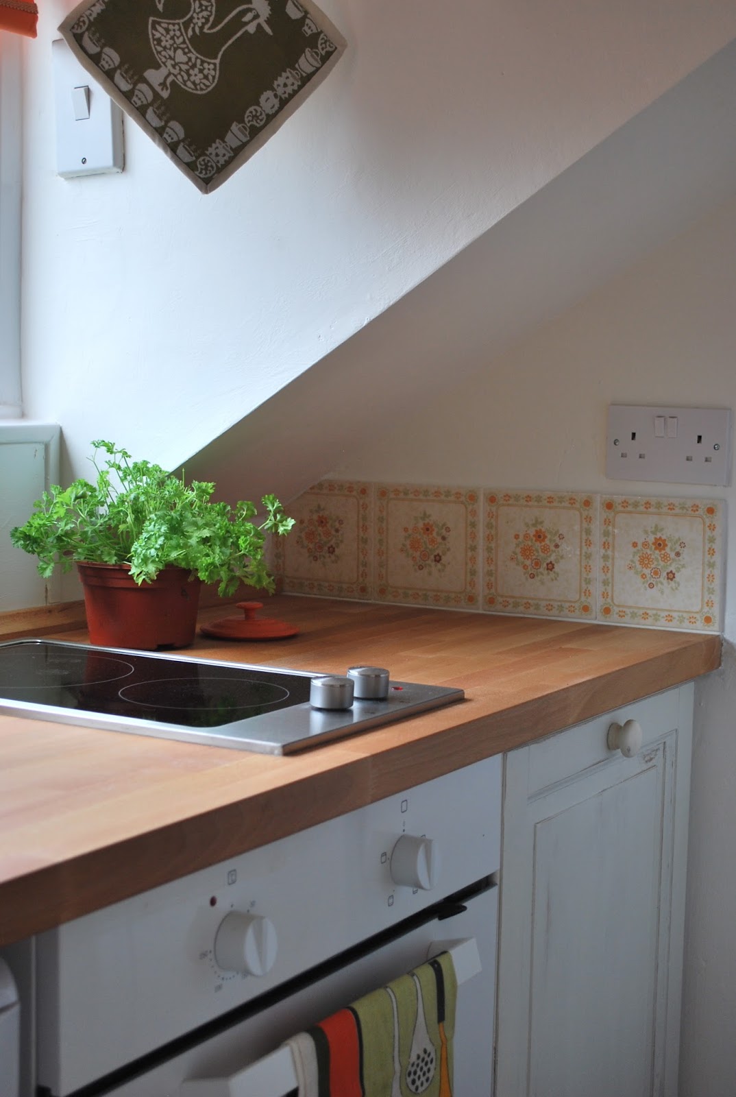 Above in my own kitchen I decided to go retro with appliances because it was the best way to add colours. We all know that SMEG sell these glorious Fridge/Freezers in classic retro colours with handles reminiscent of old Fifties car door handles and that smooth sleek rounded corners of old American fridges. The fabric I've used to hide the washing machine is original fifties barkcloth. The background being pale grey with pops of red, blue yellow and green which were fashionable then. The little scenes are of European influence, like Italy and the Mediterranean, places that were now accessible.